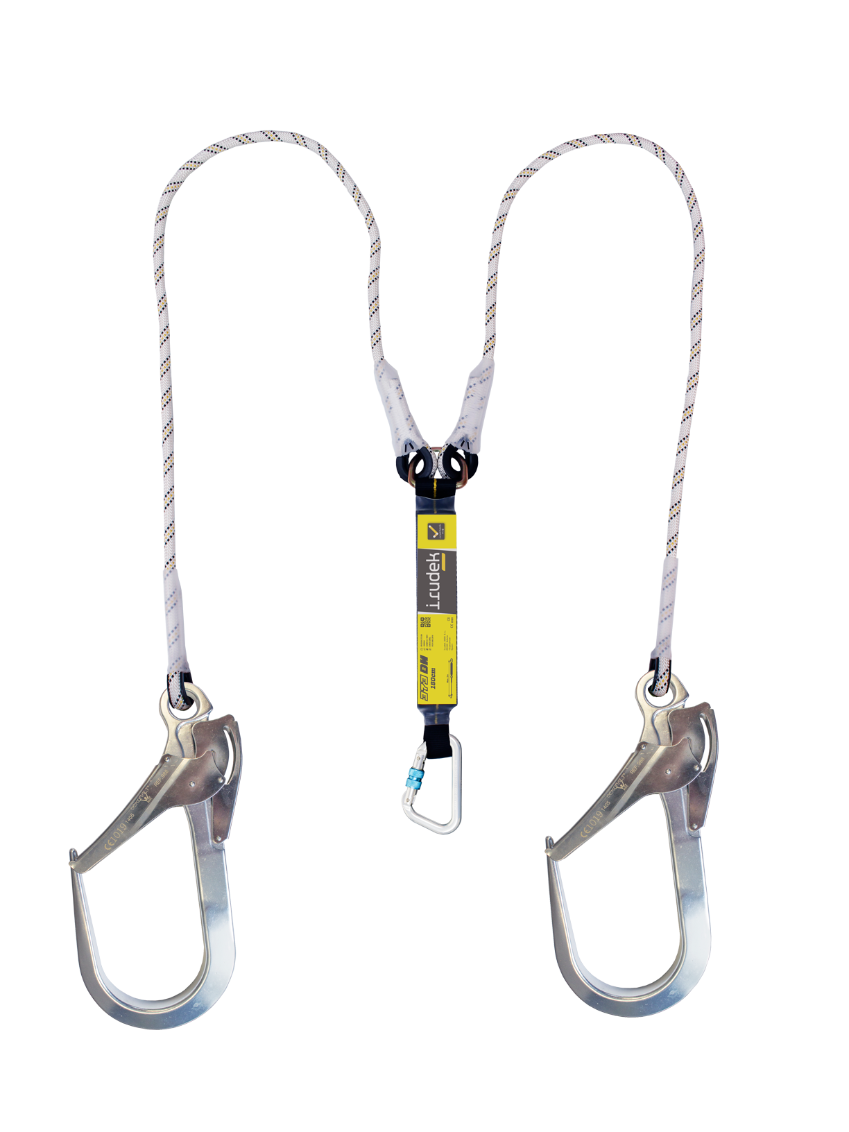 Assorbitore di energia con doppia corda semistatica e connettori in alluminio con apertura di 100mm, progettato per attutire le cadute riducendo la forza di impatto trasmessa all’operatore a meno di 6kN.
