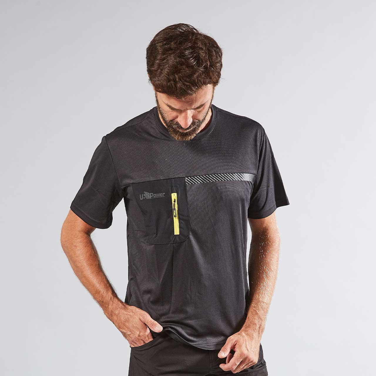 T-Shirt estiva con banda reflex sul lato sinistro del petto e stampa logo reflective “U-Power” sul lato destro per i colori Lime Stone e il Burnt Olive, mentre nella versione Black Carbon il logo è in transfer reflective nero e la banda è testurizzata in carbonio.