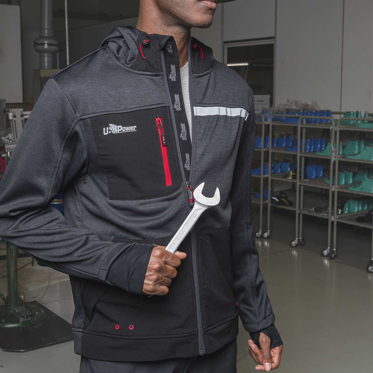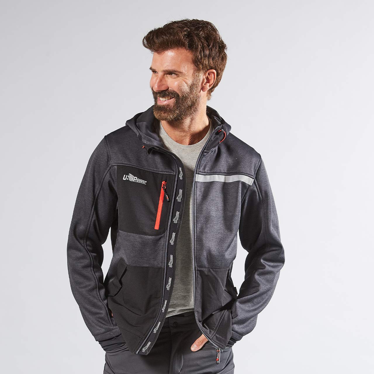 Il design è arricchito da una banda reflex sul petto e sul cappuccio nelle varianti colore Asphalt Grey e Dark Green, mentre nella versione Black Carbon le bande hanno un effetto carbonio. Stampa logo reflective “U-Power” sul petto lato destro.