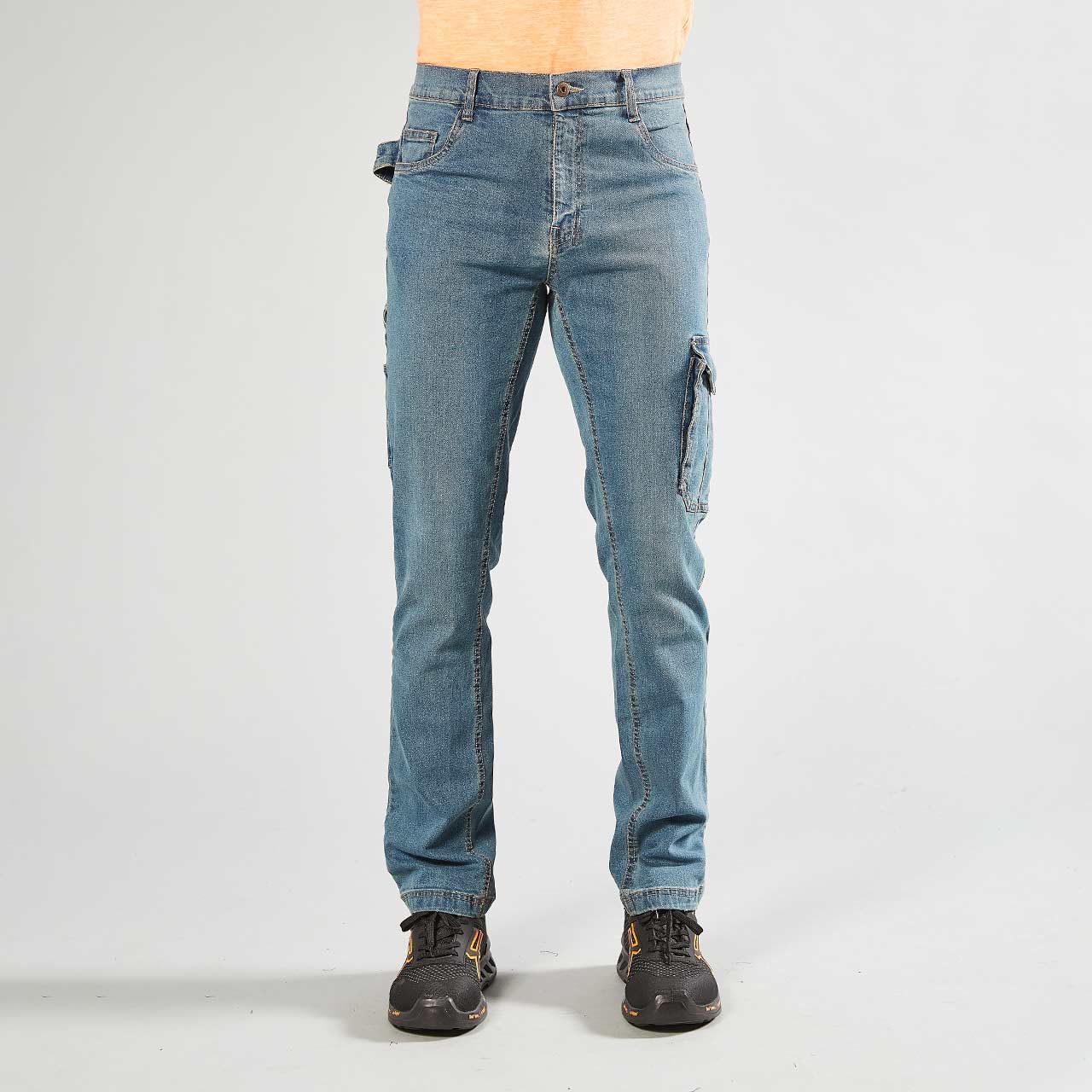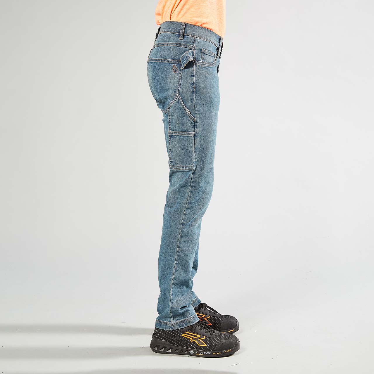 Jeans 5 tasche elasticizzato con tascone laterale, tasca porta metro e fettuccia porta martello. Vestibilità slim-fit. Nastro rosso/reflex su passante tubolare posteriore. Zip YKK.