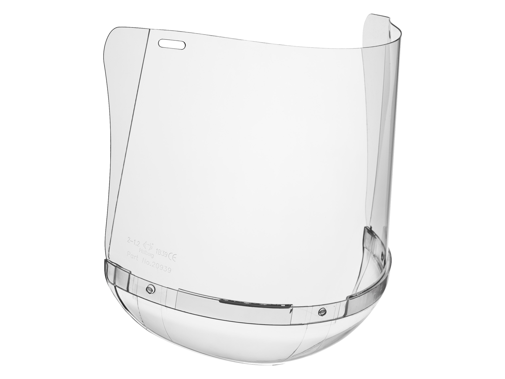 Visiera in policarbonato incolore da 220mm con mentoniera, resistente agli impatti.