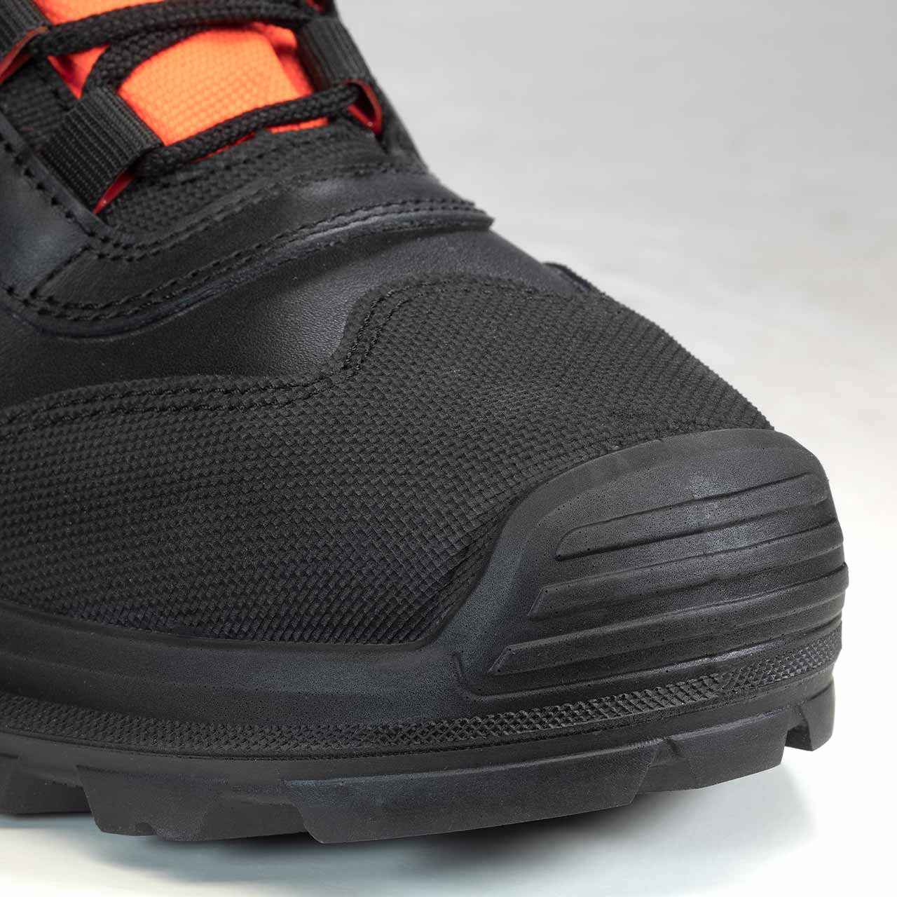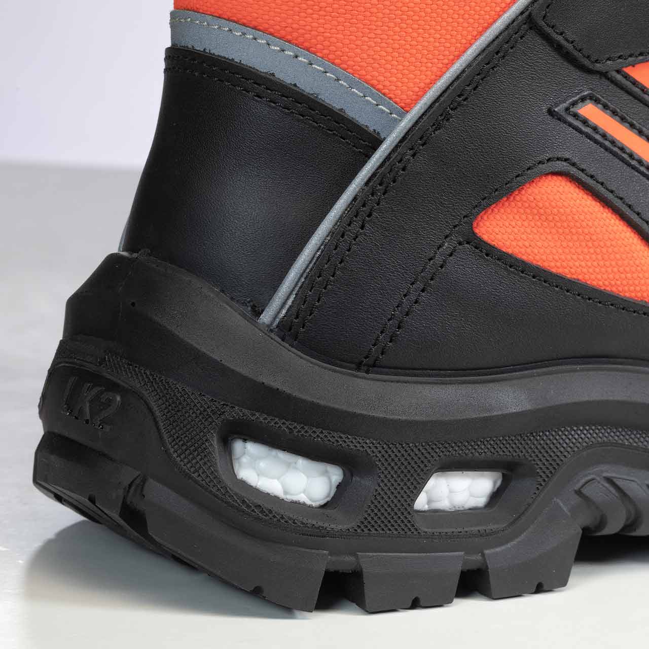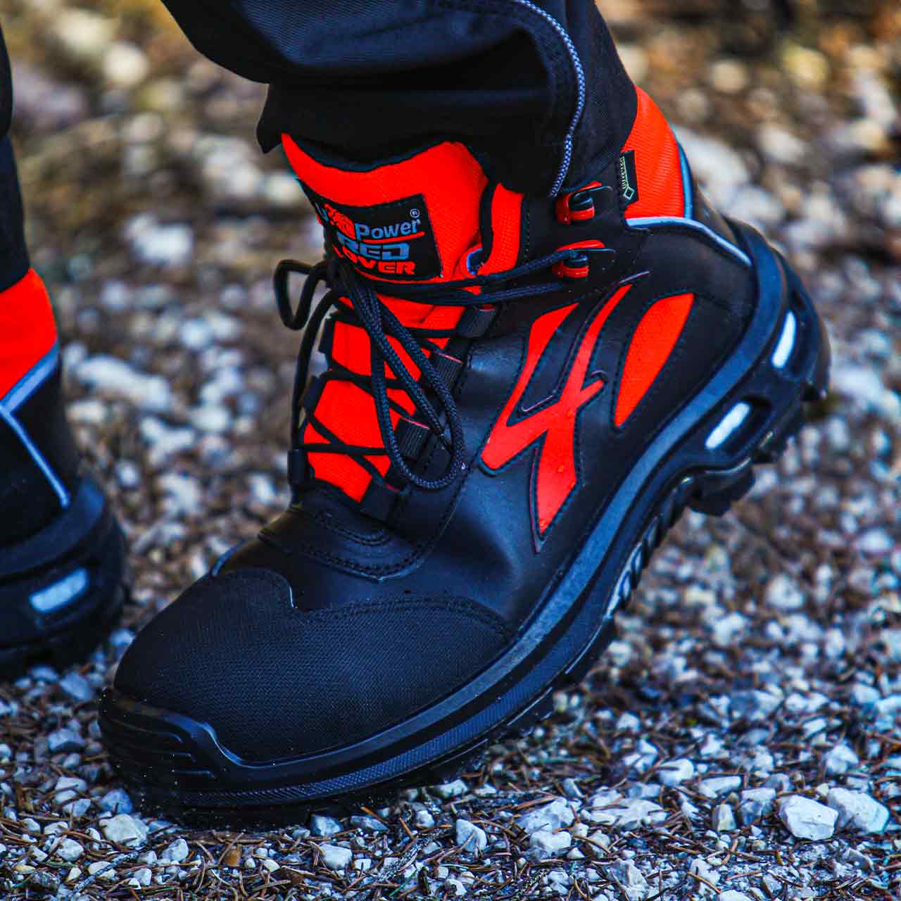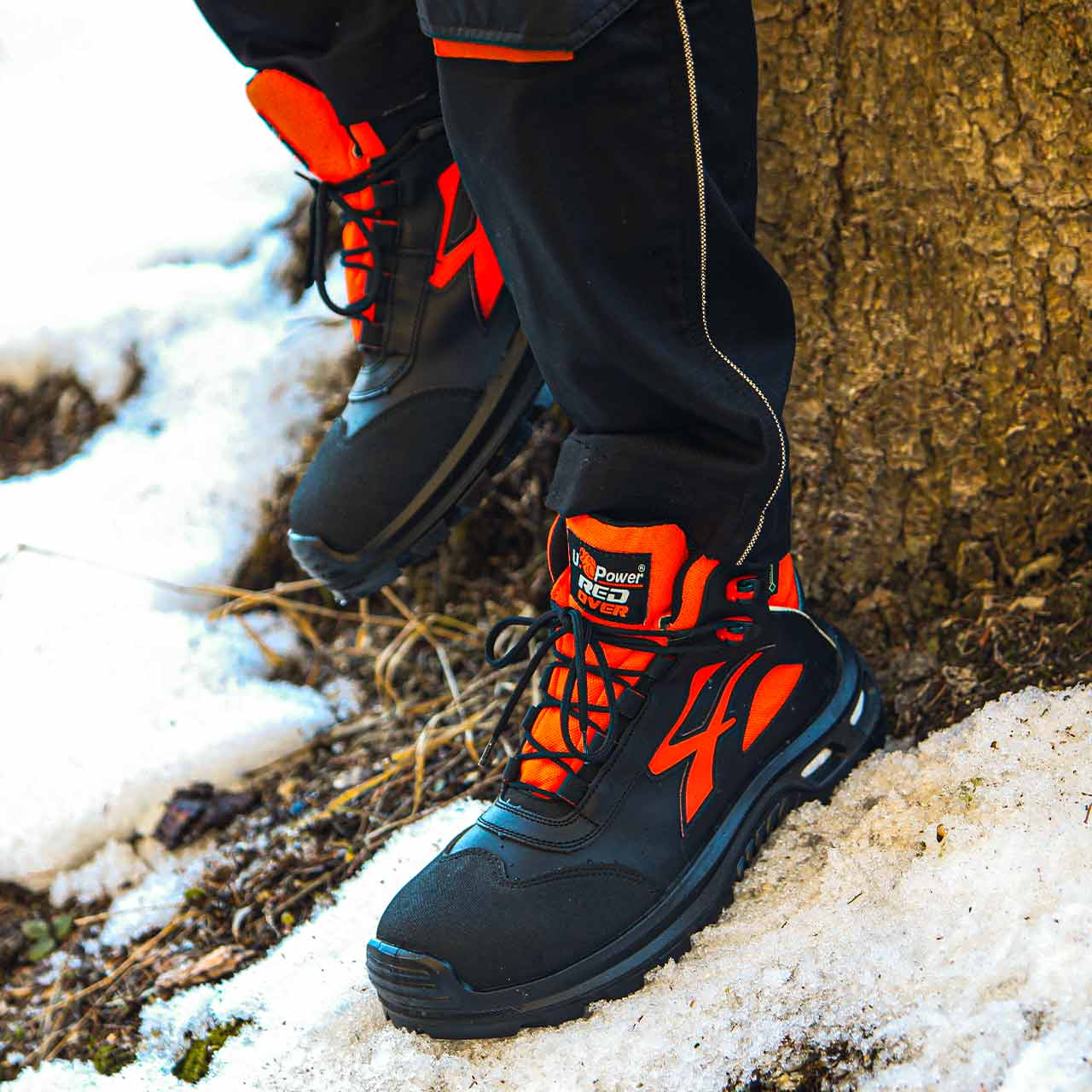 Scarpa antinfortunistica alta e comoda, della linea Red Over di U-Power, tomaia in morbida pelle fiore, inserti in textile e puntale antiabrasione, idrorepellente in composito, fodera Gore-Tex e suola in Soffice PU espanso e Infinergy®.