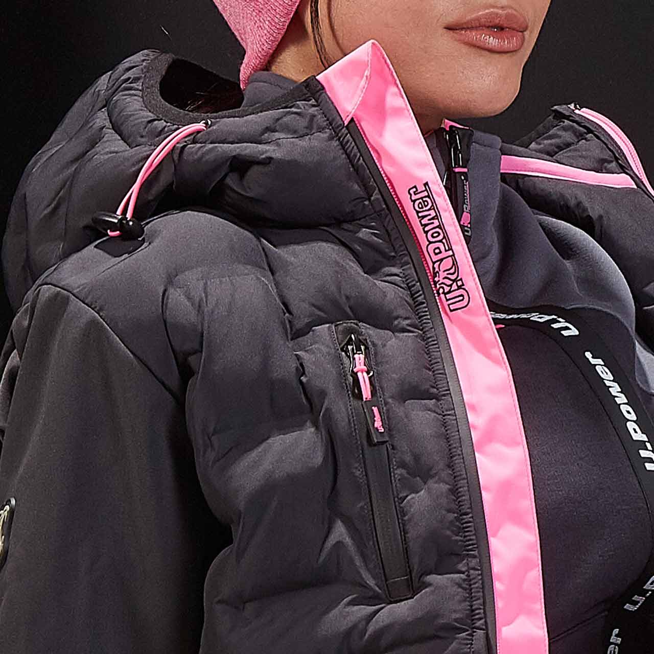 Cappuccio fisso e regolabile, polsini elasticizzati e chiusura centrale con zip impermeabile.