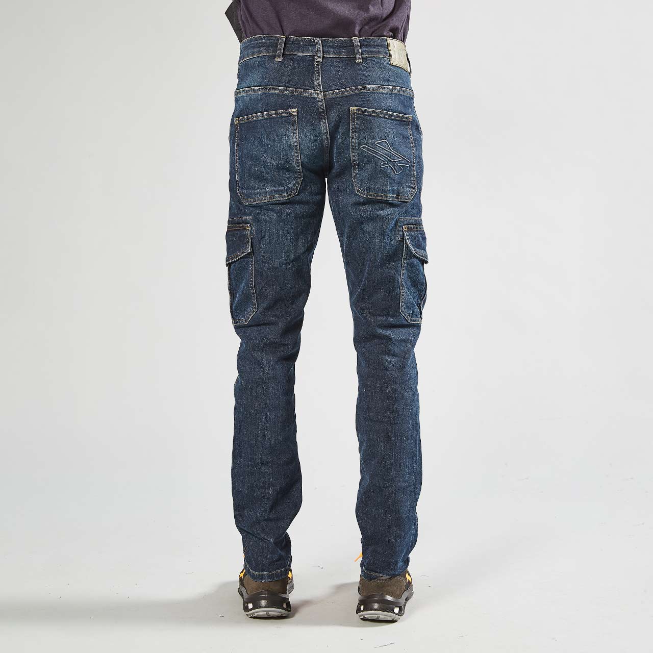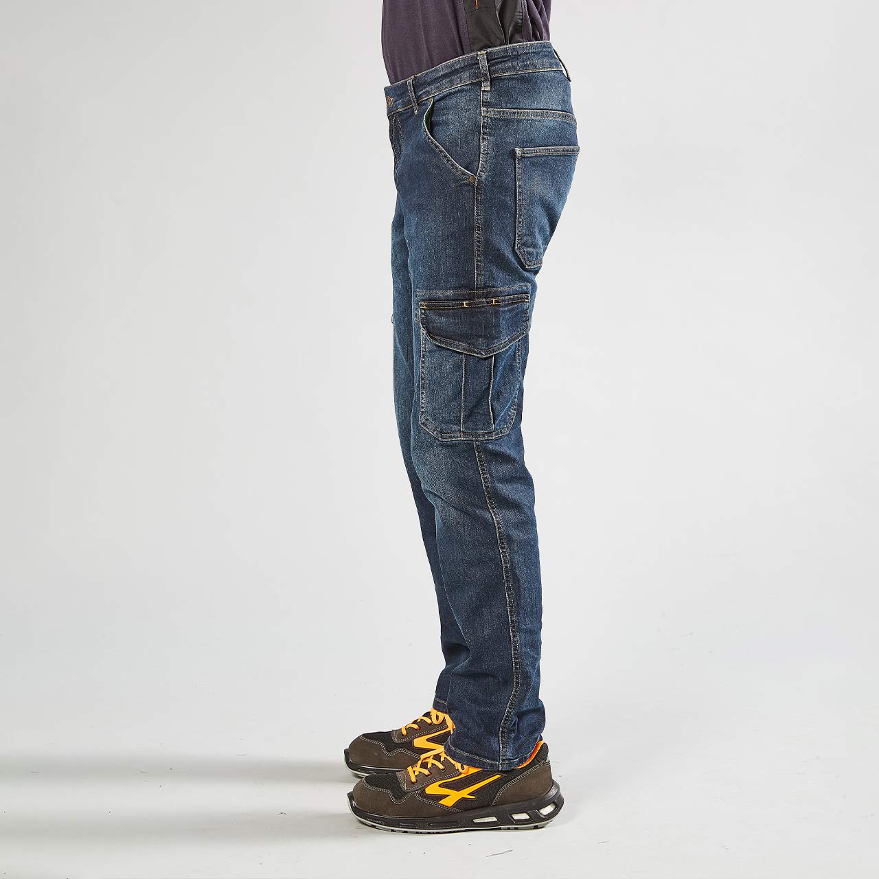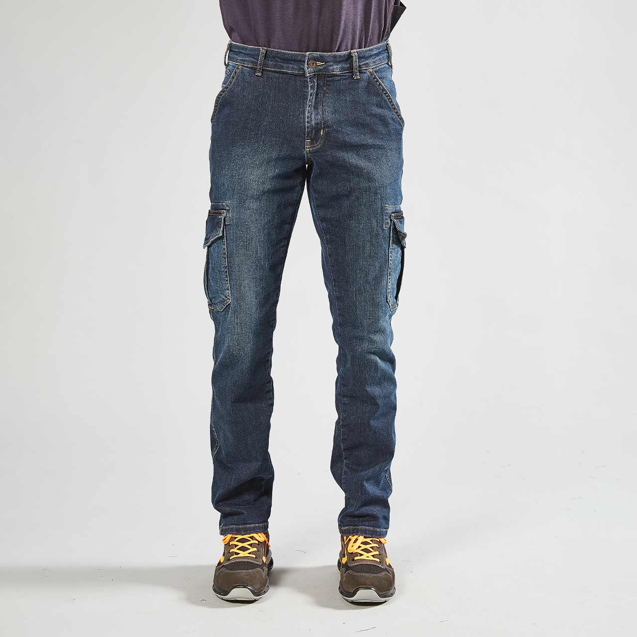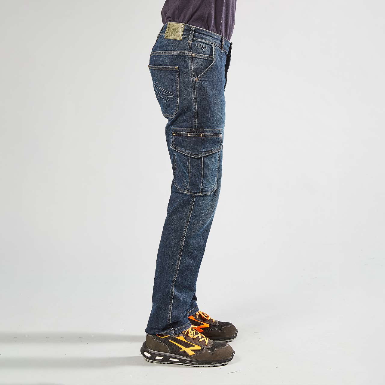 Jeans cargo da lavoro in tessuto elasticizzato con due grandi tasconi laterali con bottoni a pressione e fori porta penne.
